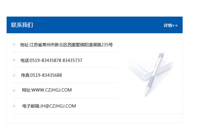地址:常州市新北區(qū)友邦商務(wù)大廈1幢16、17層  電話:0519-85101652  傳真:0519-85112595  郵編:213022  網(wǎng)址:www.cz-jiayue_cn.11500j.com  郵箱:xiajifengaa@163.com
